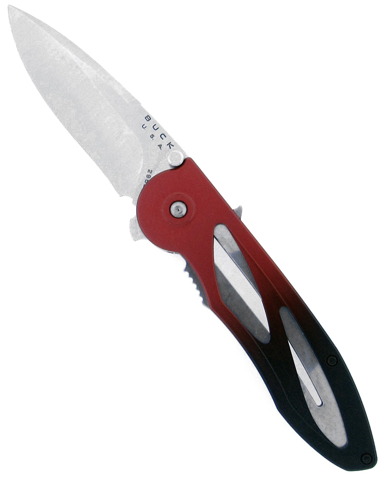 Buck Knives Tempest a full size assisted opening Buck knife with patent pending ASAP (Advanced Spring Assisted Performance) technology and skeletonized handle with pocket clip for everyday use. Includes cam lock safety. There may be no higher calling for a knife than simply to be at hand and ready for life's unexpected jobs. These Buck knives do it in fine style. Black and red anodized aluminum handle scales with steel liners. Satin finished 420HC stainless steel blade. New in box.