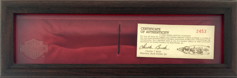 Limited Edition III V-Twin Series Harley Davidson Buck Flathead commemorative dagger knife. Nice contoured pakkawood handle with a brass and black micarta spacer. Mirror polished 420HC stainless steel dagger blade with beautiful deep etch of man on his Harley Davidson Flathead with a side car in the countryside, also an etch of a Flathead motor by itself and says V-TWIN SERIES EDITION I FLATHEAD with the Harley Davidson logo. The back of blade is etched with the serial number #xxxx of only 3000 made. Brass bolster. Like new condition and includes a handsome glass and walnut display box with the Harley Davidson logo etched into the glass and certificate of authenticity.