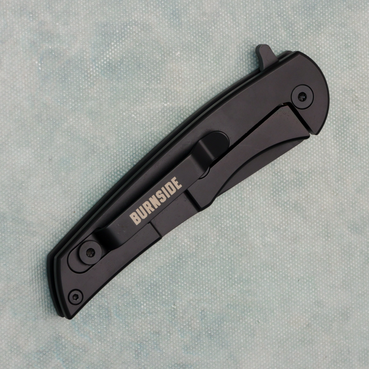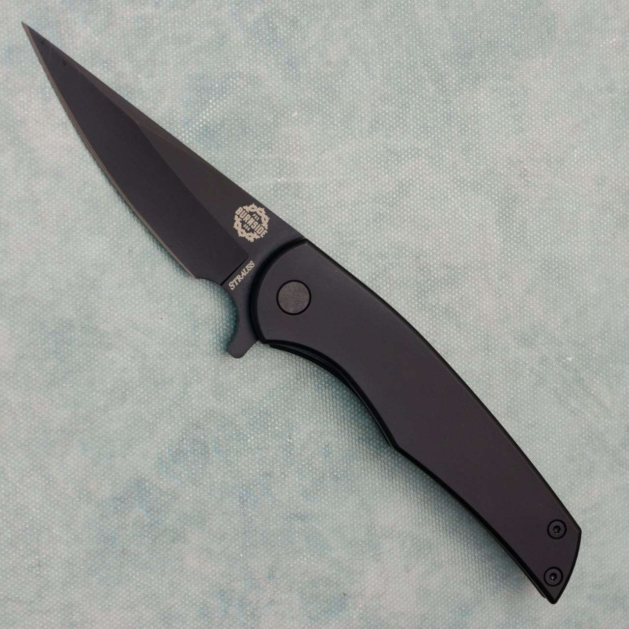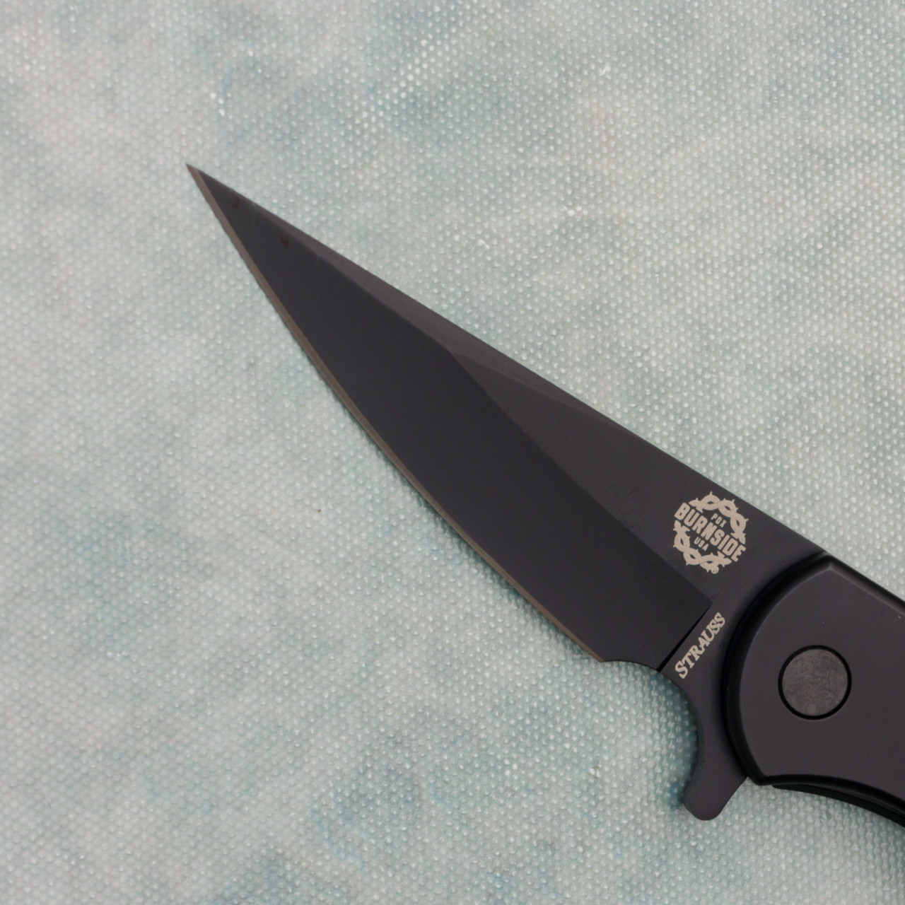 Burnside Knives Strauss with black titanium handles. Blade is black D2 , and the knife has flipper deplyoment. Knife has a few light snails on handle and couple blemishes at tip of blade, has no box.