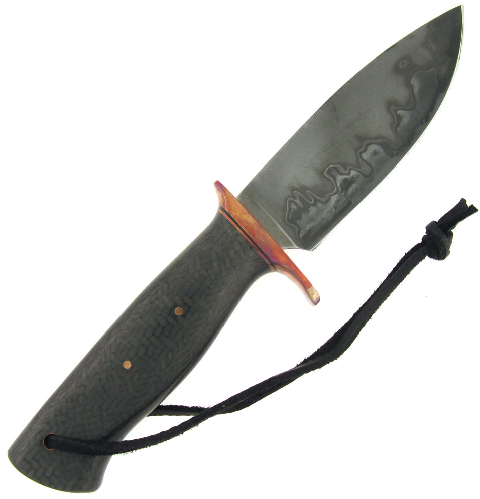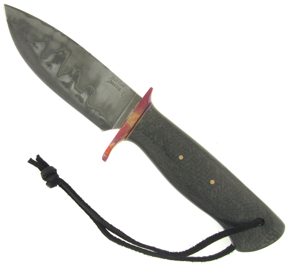 Awesome contoured carbon fiber handle, feels excellent in hand. Unique San Mai Sandvik over W2 tool steel drop point blade. The blade is stamped Burr Oak Nevling. Copper double guard. Copper handle pins and lined lanyard hole. Leather lanyard. Brand new with black basket weave leather sheath. Also in black zip up pouch with certificate of authenticity.