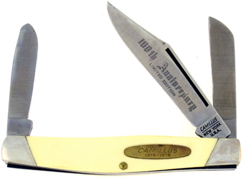 Saw cut off white delrin handles. Stainless steel swedged clip point blade etched 100TH ANNIVERSARY LIMITED EDITON with a nice long nail pull. Also stainless steel sheepsfoot and spey blades. Blades have real good strong snap. Brass liners, handle pins, and inlaid oval shield that says CAMILLUS 1876-1976. Nickel silver bolsters, the front bolster is etched with the serial number #9808.