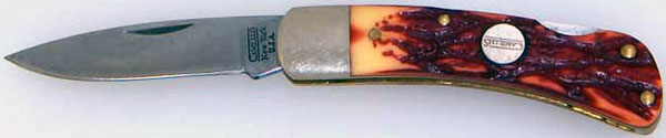 Jigged delrin handles. Nickel silver front bolsters and inlaid Camillus shield. Brass liners and handle pins. Blade tang says CAMILLUS NEW YORK U.S.A. Really a great little pocket knife, bargain priced.
