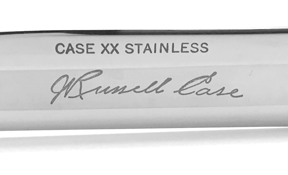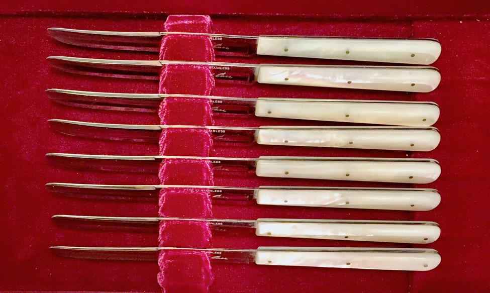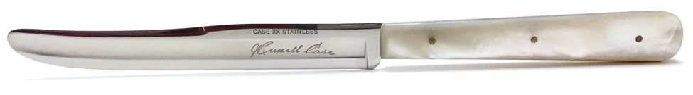 Beautiful antique mother of pearl handle scales. Two tone finishes stainless steel thin blades with satin grooves and mirror polished flats. The blades are swedged. Each blade is etched CASE XX STAINLESS with Russell Case's signature on the front and TRADE MARK on the back. Full tang construction with three nickel silver handle pins. The whole set of eight knives comes in the original velvet lined genuine leather covered display box. This beautiful and rare set probably made in the 1940's. This is a must have set for your collection or fine dining china needs. Mint condition!