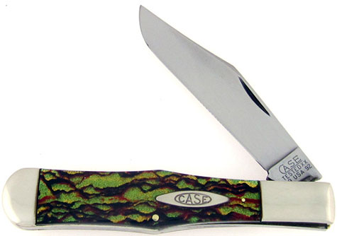 Real nice Christmas Tree Celluloid handle scales. Polished stainless steel clip point blade has excellent open, close, and half snap. Tang stamped CASE TESTED XX 19 USA 92. Brass liners. Nickel silver bolsters, handle pins, and inlaid Case oval shield. Proudly made in the U.S.A. in 1992. Comes brand new in original blue two piece box.