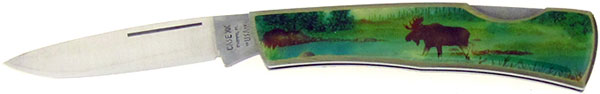 Real nice acrylic covered handle scales with a Moose in Nature Scene on both sides. Satin finished stainless steel drop point blade with long nail pull. Tang stamped CASE XX BRADFORD, PA. 19 USA 93. Stainless steel liners. Great quality made Case XX lock back pocket knife. Comes brand new in box.