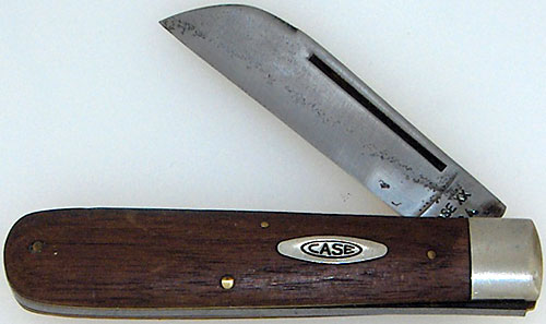 Walnut handles. Carbon steel sheepsfoot blade that is swedged toward the tip and has a nice long nail pull. Tang stamped CASE XX U.S.A. - 11031 SH. Brass liners and handle pins. Nickel silver bolsters and inlaid Case oval shield. Nice old Case Rope knife made in the U.S.A. Excellent condition, blade shows some patina, open and half snap are good but close snap is so so. **Not the same as the one pictured**