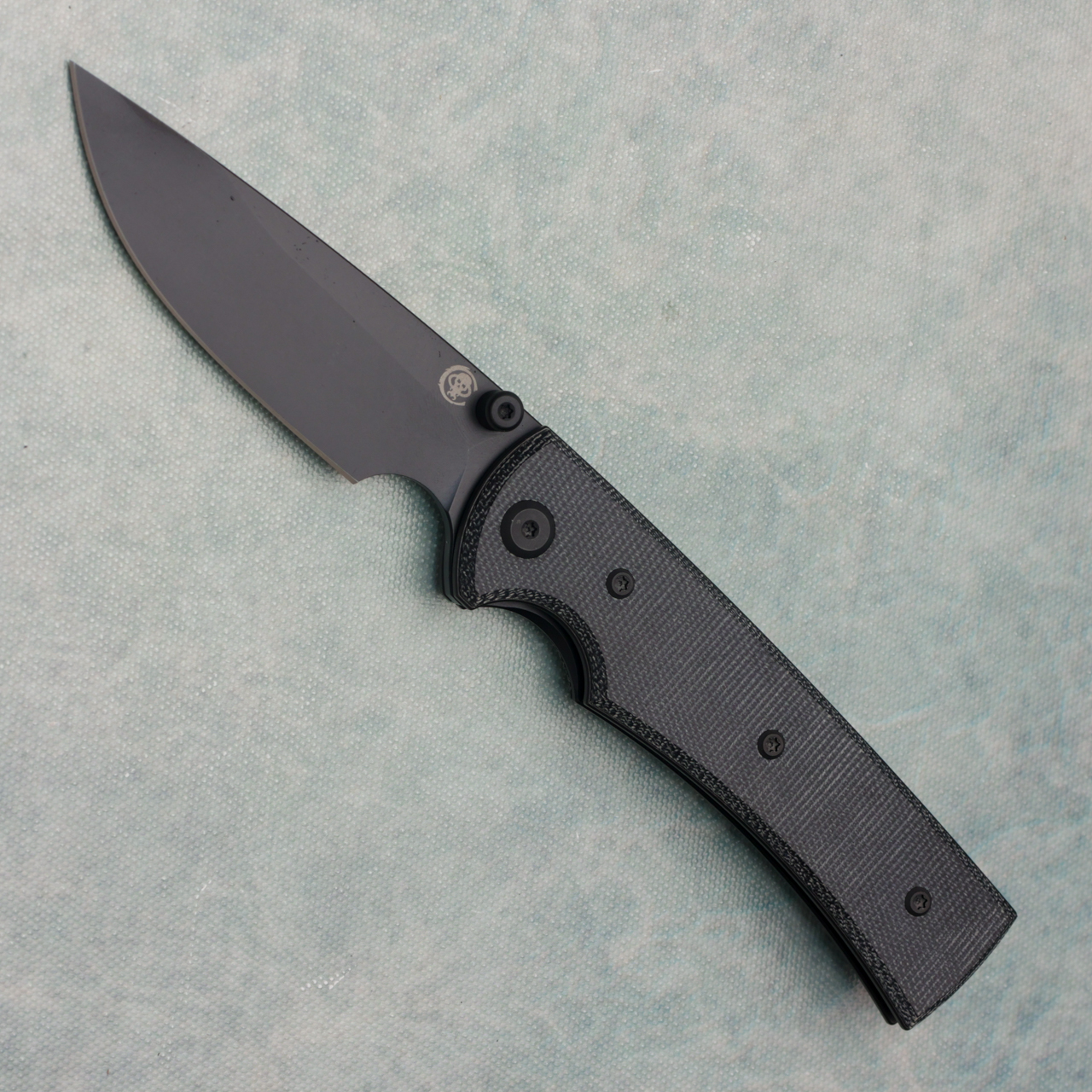 This blue label Liberation 229 features black micarta handles. Black finished Elmax drop point single edge blade with standard cutting edge. Thumb stub opening mechanism. Extra Skull Clip included. Brand new in box.