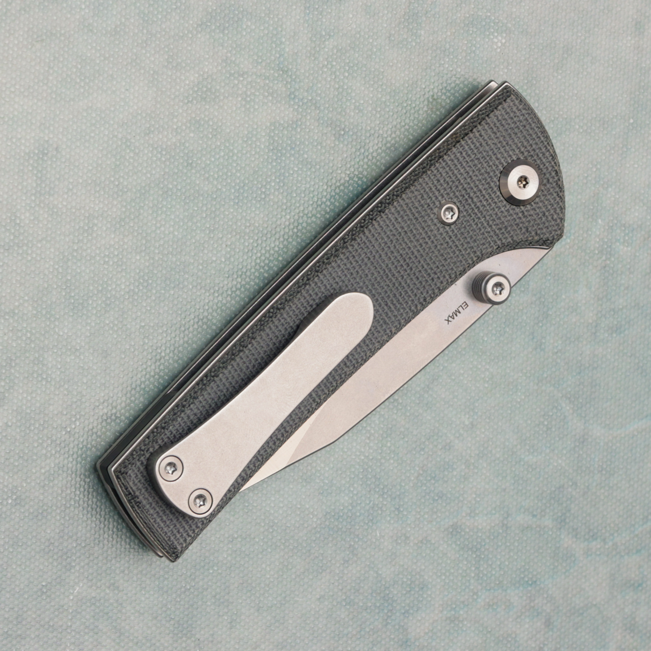 This blue label Scapegoat Street features black micarta handles. Satin finished Elmax spear point blade with standard cutting edge. Thumb stub opening mechanism. Extra Skull Clip included. Brand new in box.
