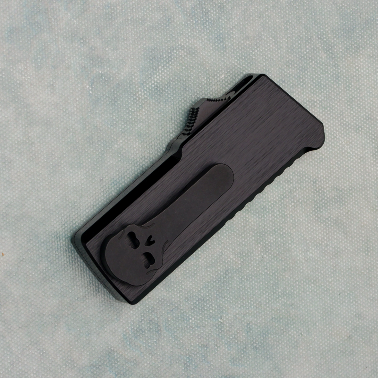 The Chaves CHUB is a sweet little edc OTF utility knife! This one features a satin black finished aluminum handle, and all black hardware. It has the classic Chaves skull pocket clip on back and takes standard replaceable utility blades. We suggest grabbing a variety pack of laser patterned replacement blades! Brand new in box.