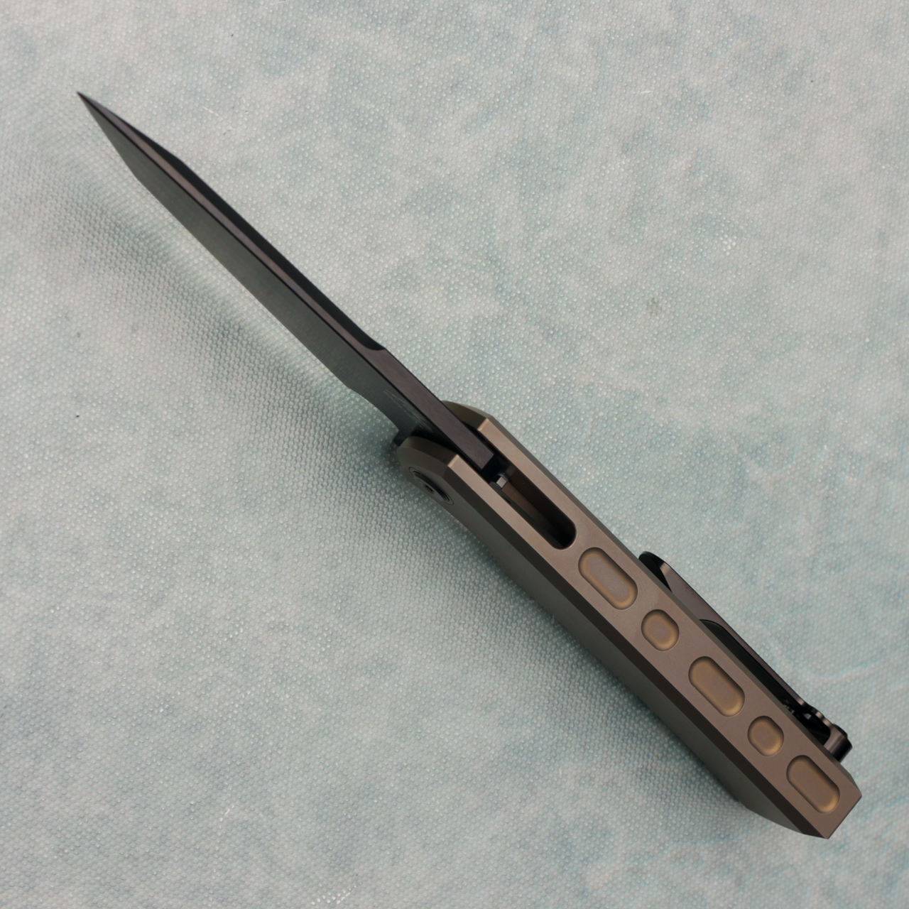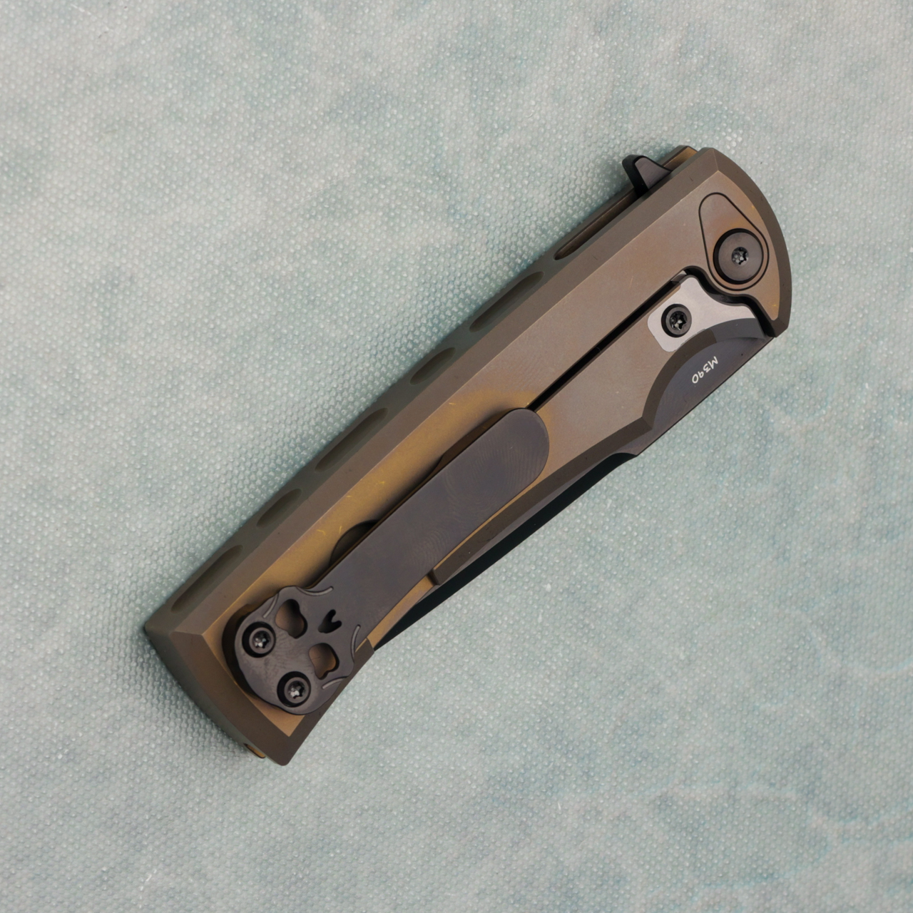 The new Chaves Liberation Street integrals are great! Bronze titanium handles, and a PVD M390 tanto chisel ground blade round out this knife. Brand new in box.