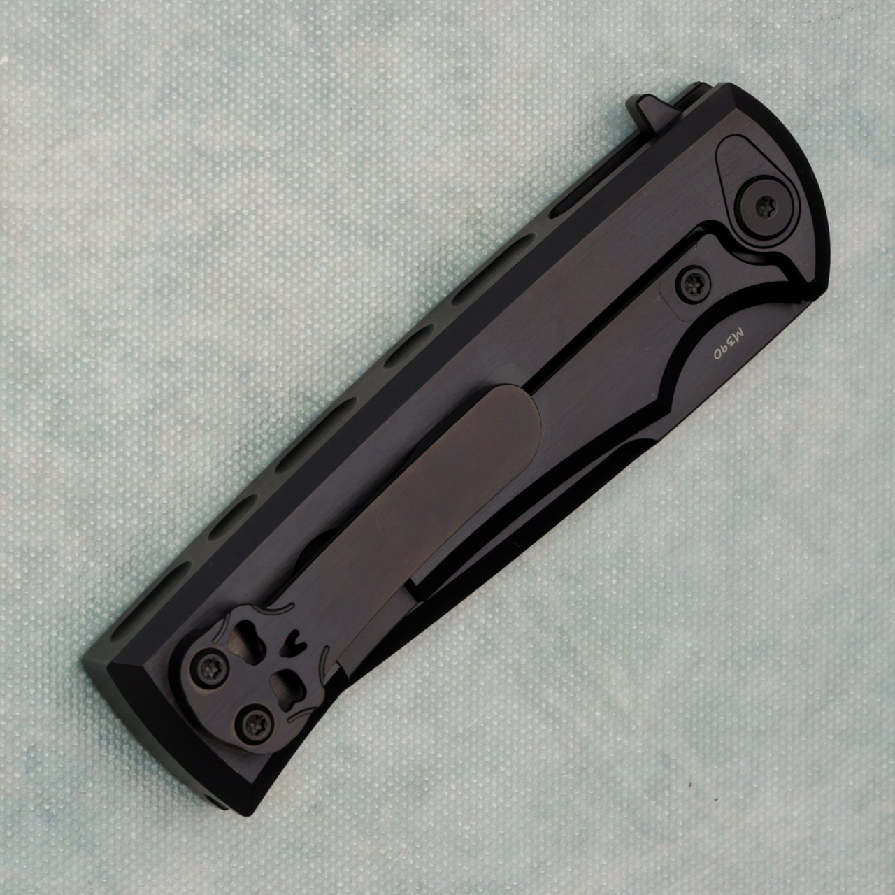 This model features a satin DLC finished integral titanium handle. Stonewash DLC finished M390 tanto blade with satin DLC flats, with standard cutting edge etched with Chaves logo. Framelock with replaceable lockbar insert. This is one great knife, with a great price point. Brand new in box.