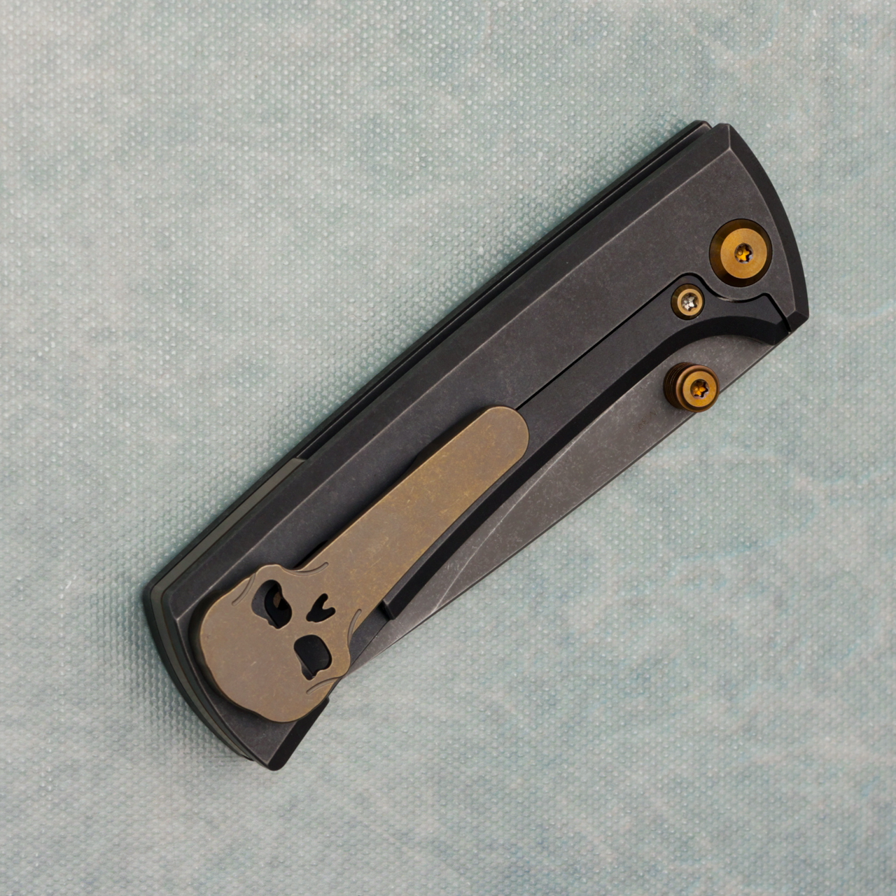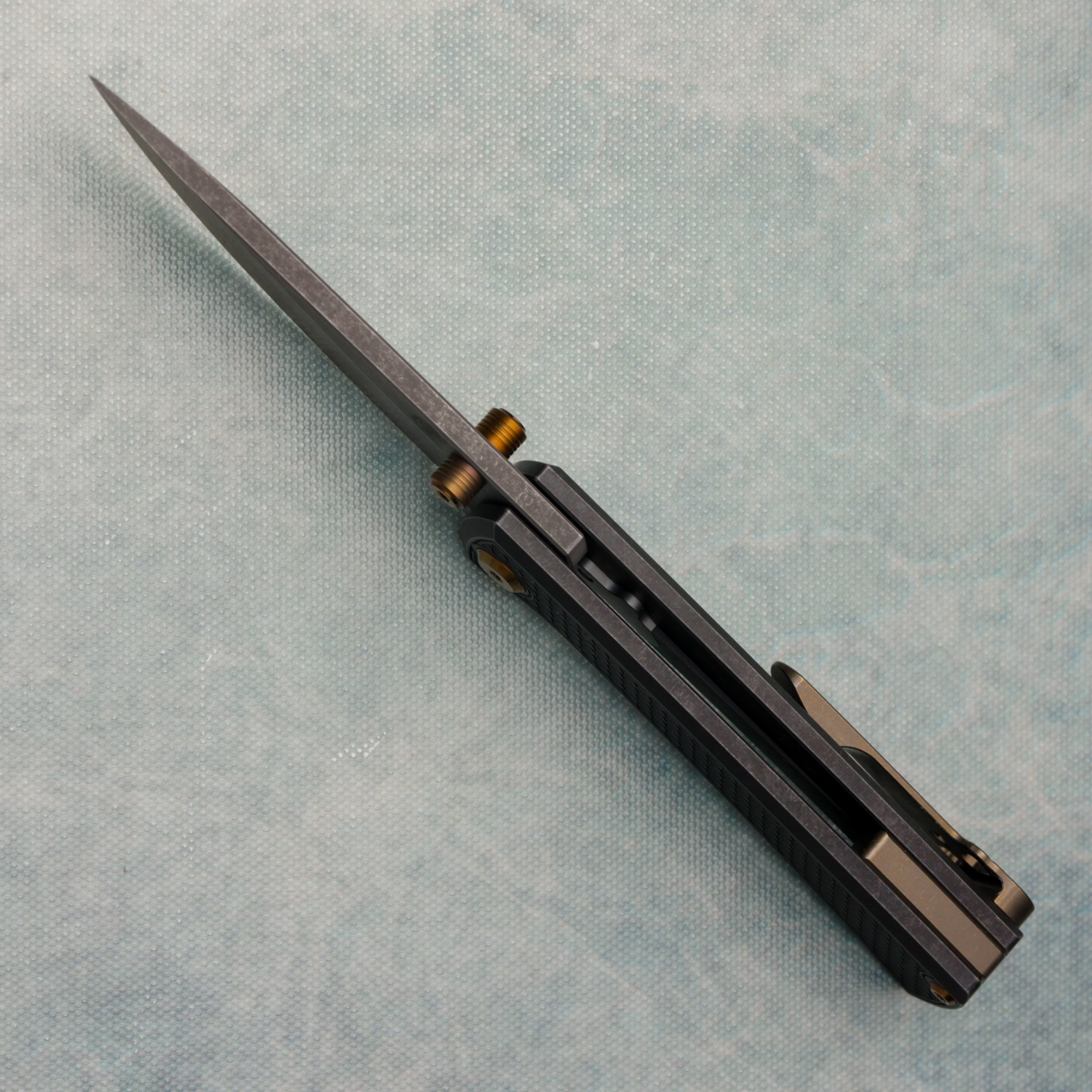 This version features a black titanium dragon scale handle with bronze accents, and an acid wash M390 drop point blade. Comes brand new in the box.