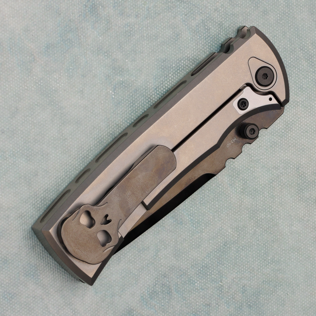 This model features bright stonewash titanium handles with a swappable magnetic bright stonewash titanium inlay, the blade is M390 with a bright stonewash DLC finish. Brand new in box.