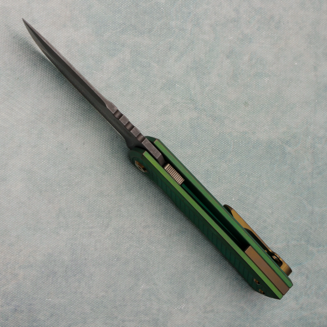 This Mid-Tech version features green anodized finished titanium handle with dragon scale pattern. Acidwash finished M390 drop point blade with standard cutting edge etched with Chaves key logo. Framelock with replaceable lockbar insert. Complete with a bronze anodized tianium backspacer. Extra Standard Clip included. Brand new in box.