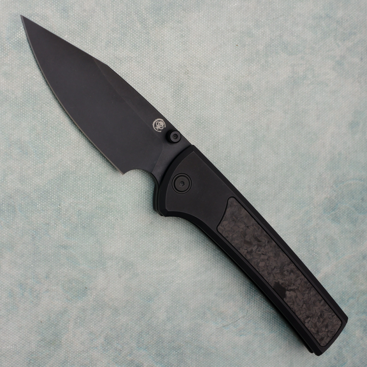 This model features black PVD titanium handles with a swappable magnetic shredded carbon fiber inlays, the blade is M390 with a black PVD finish. Brand new in box.