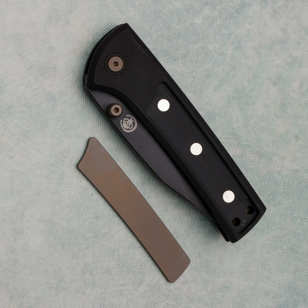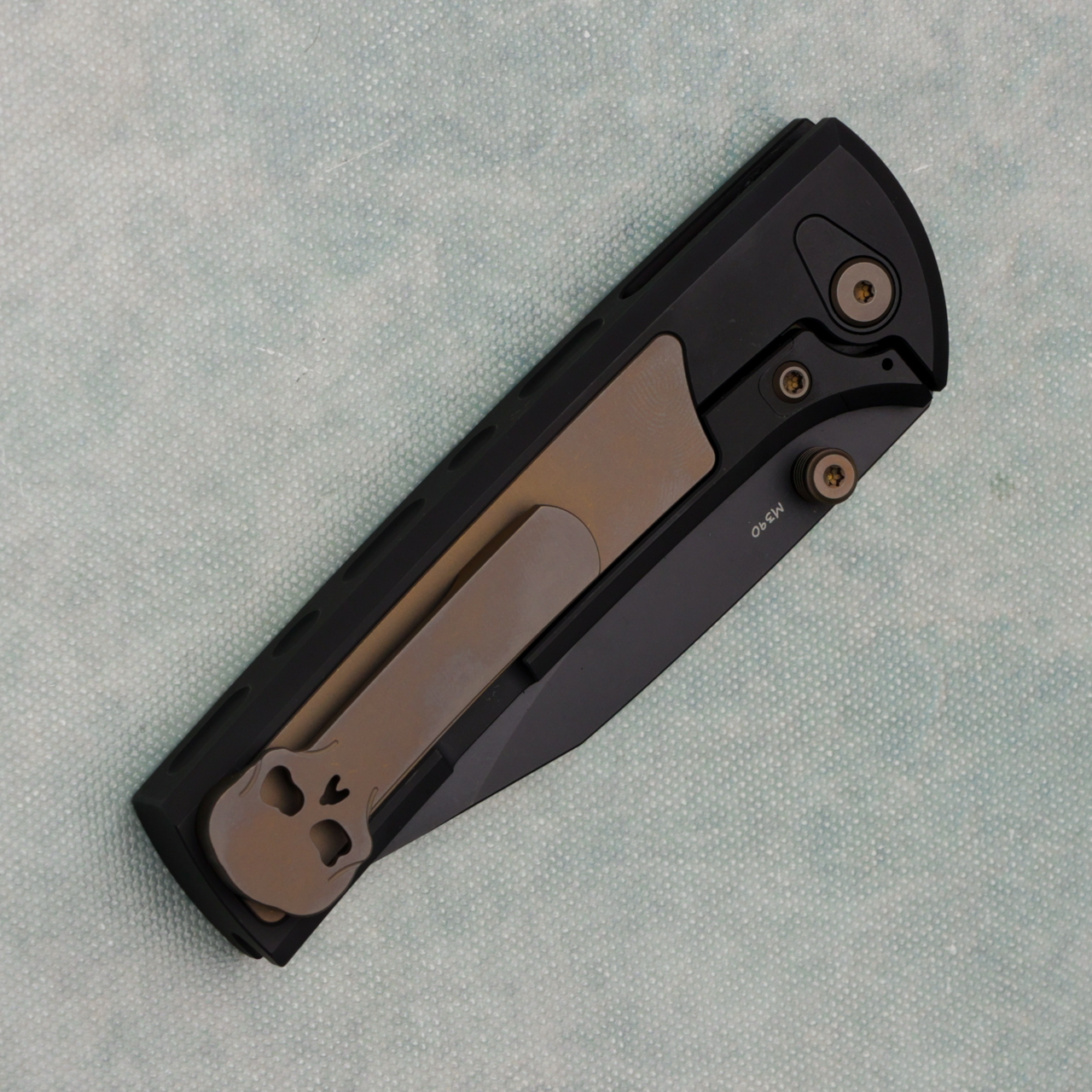 "The Suit" version features a black PVD titanium handle with bronze titanium inlay and a black PVD finished M390 Blade. Comes with the standard skull clip as well as a standard clip. Brand new in box.