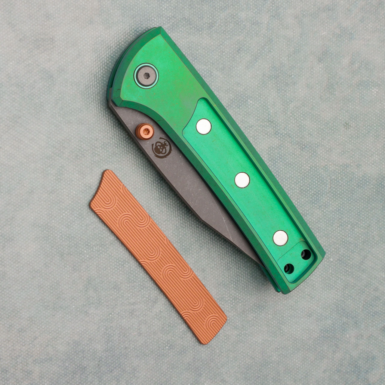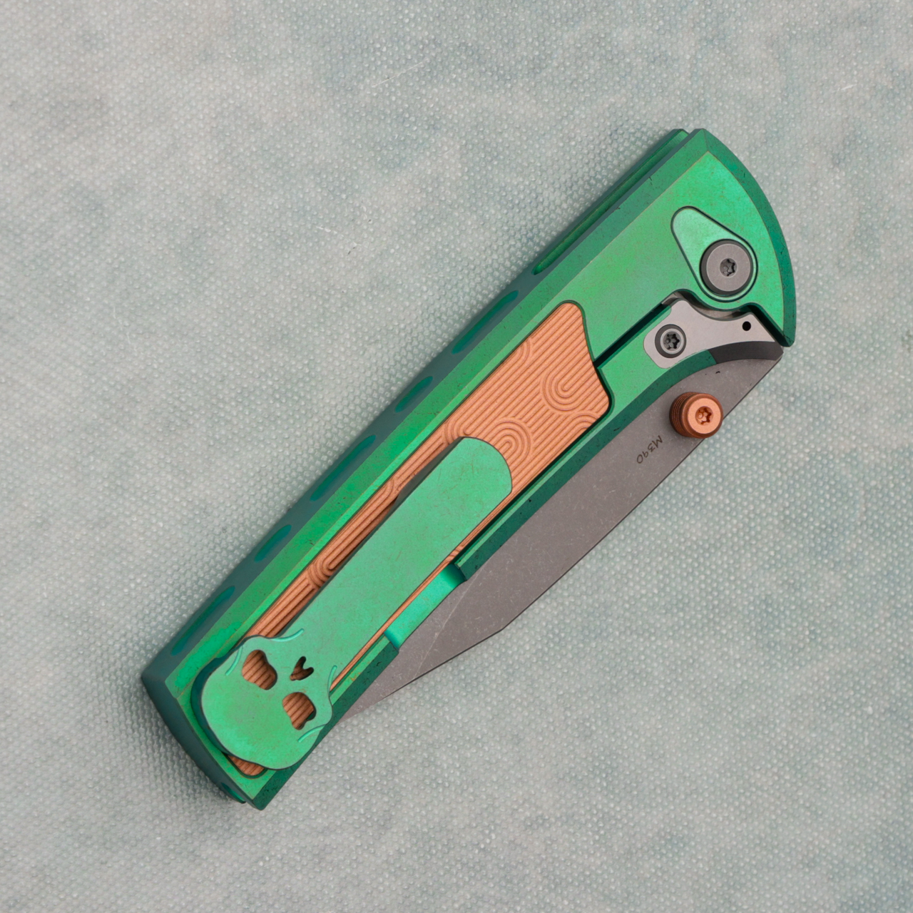 "Corundum" version features a green anodized titanium handle with milled copper inlay and a heavy blast stonewash finished M390 Blade. Comes with the standard skull clip as well as a standard clip. Brand new in box.