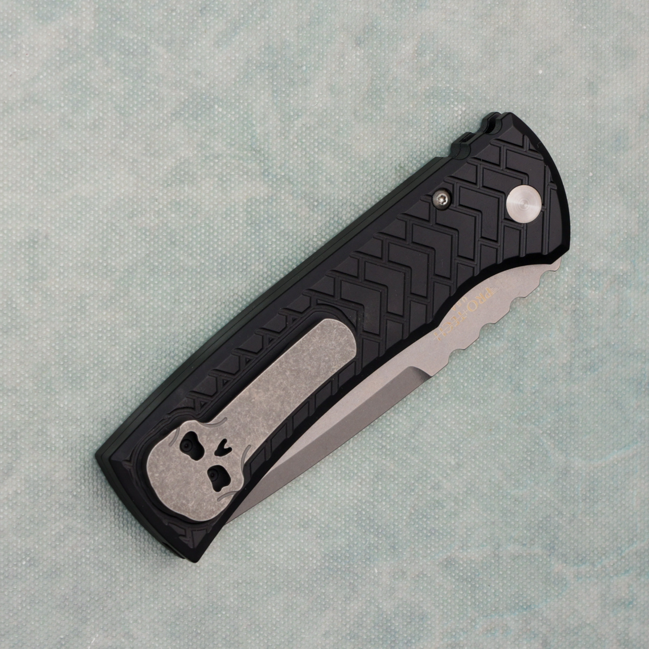 This collaboration between Pro-Tech and Chaves does not dissapoint, black aluminum handles with tread texture and stonewashed drop point blade. Skull titanium milled pocket clip. Like new in box.