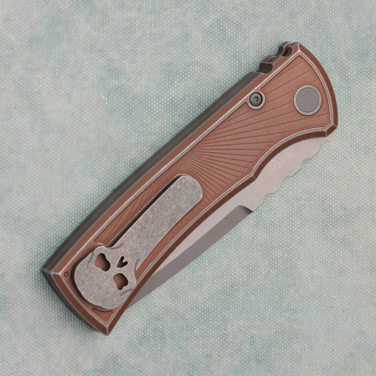 This collaboration between Pro-Tech and Chaves does not dissapoint, battleworn FDE skull key textured aluminum handles with stonewash drop point blade. Skull titanium milled pocket clip. Brand new in box.