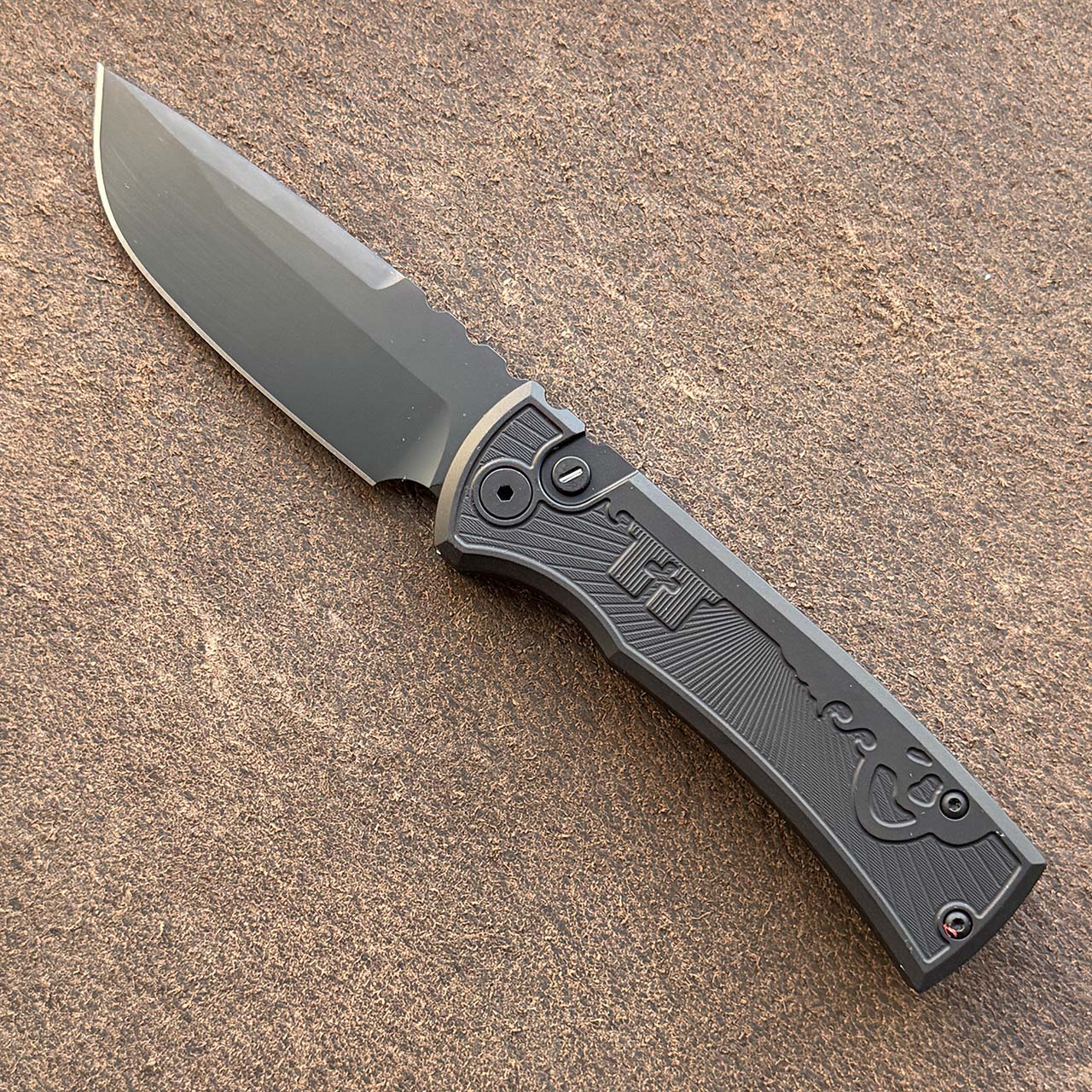 This collaboration between Pro-Tech and Chaves does not dissapoint, black skull key textured aluminum handles with black sterile DLC drop point blade. Skull titanium milled pocket clip. Tritium button. Operator series. Brand new in box.