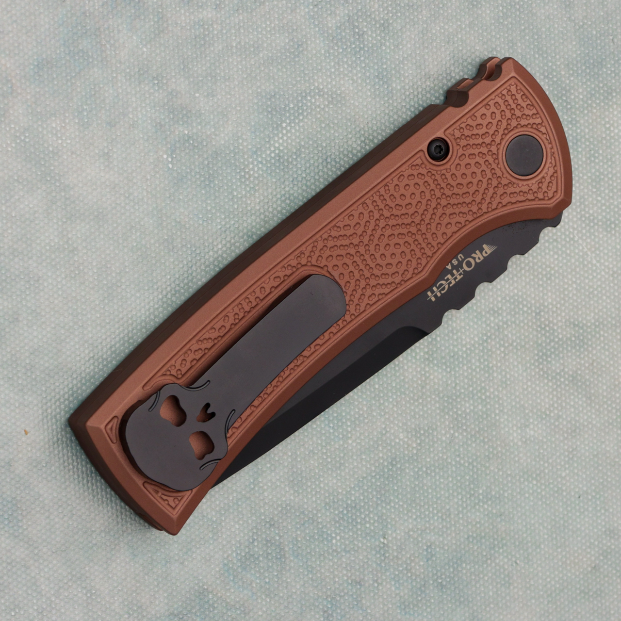 This collaboration between Pro-Tech and Chaves does not dissapoint, FDE aluminum handles with spiral stipple texture and DLC tanto blade. Skull titanium milled pocket clip. Brand new in box.
