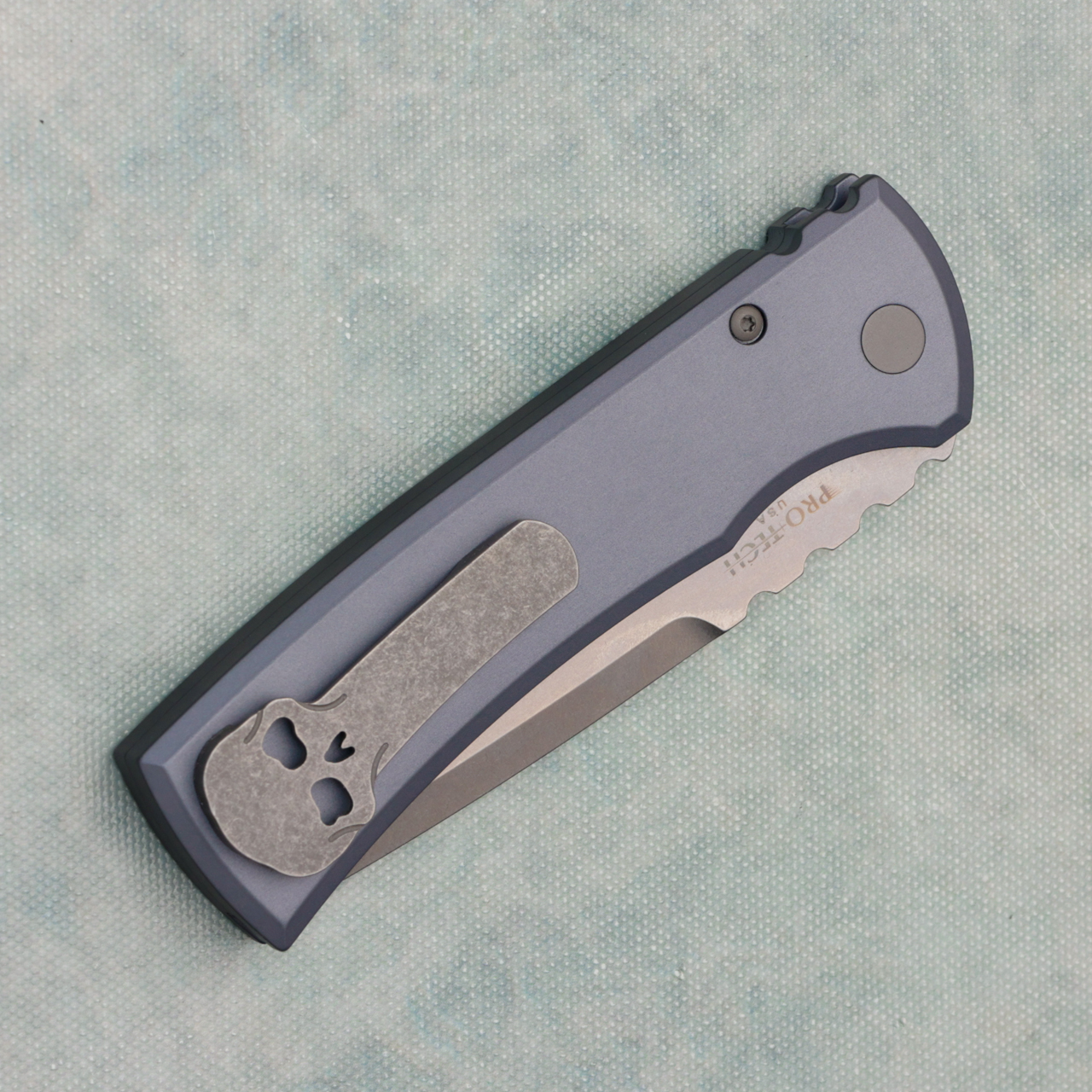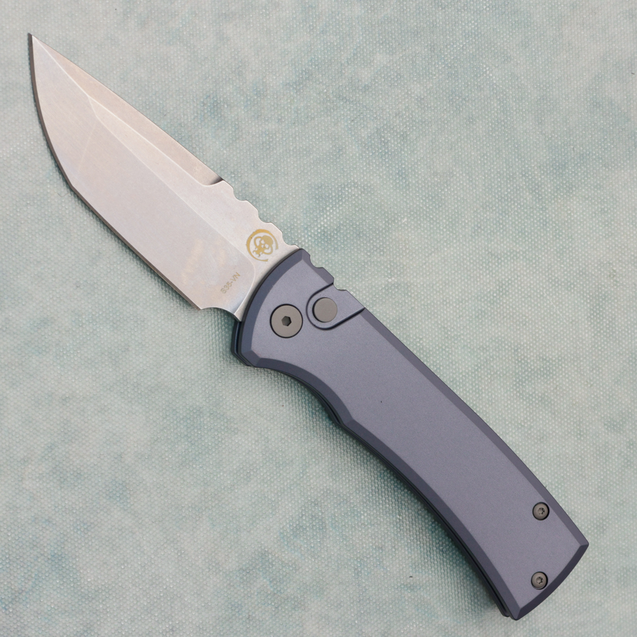 This collaboration between Pro-Tech and Chaves does not dissapoint, grey aluminum handles with stonewashed tanto blade. Skull titanium milled pocket clip. Brand new in box.