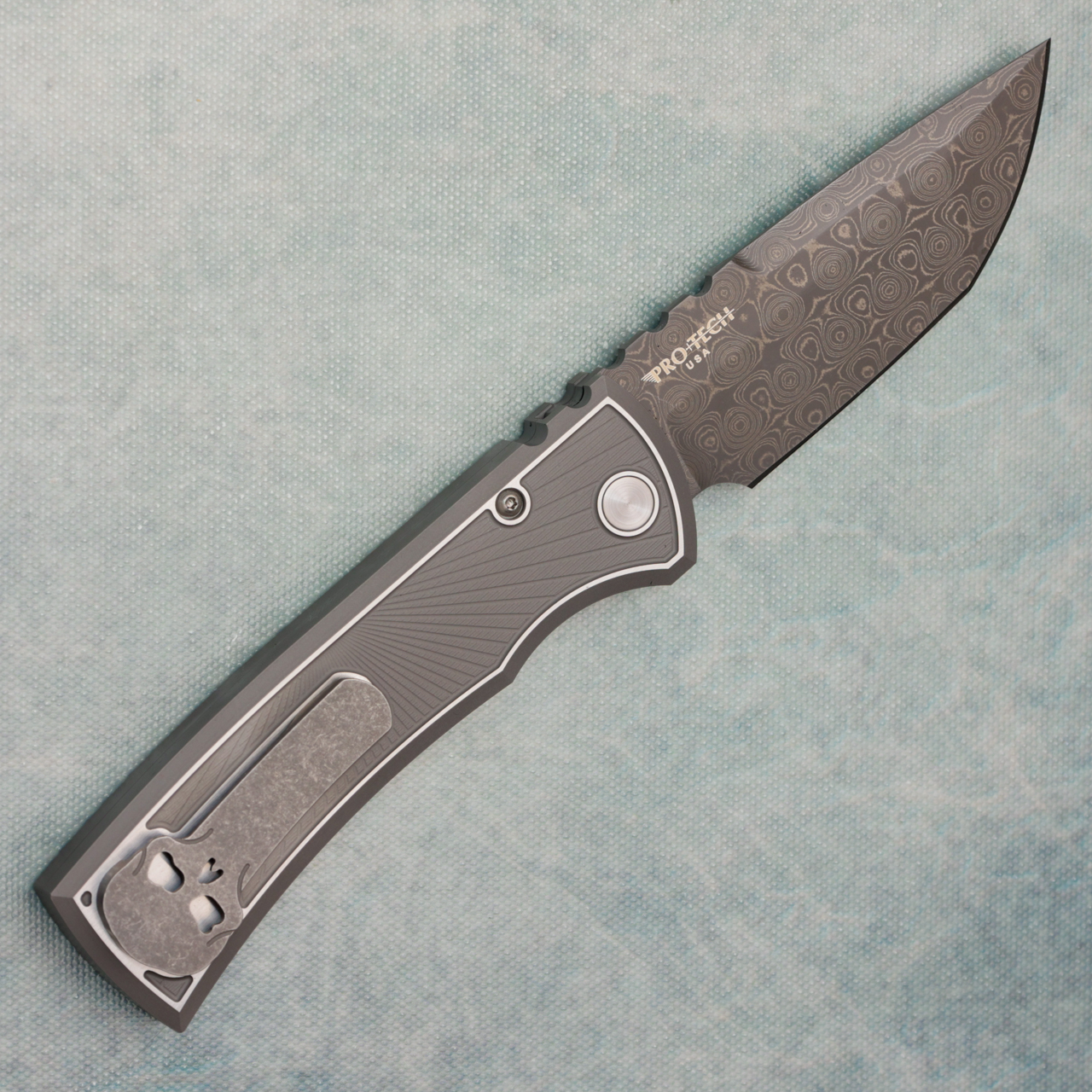 This collaboration between Pro-Tech and Chaves does not dissapoint, skull key stainless steel handles with a damasteel tanto blade. Skull titanium milled pocket clip. Pearl button, satin hardware. Brand new in box.