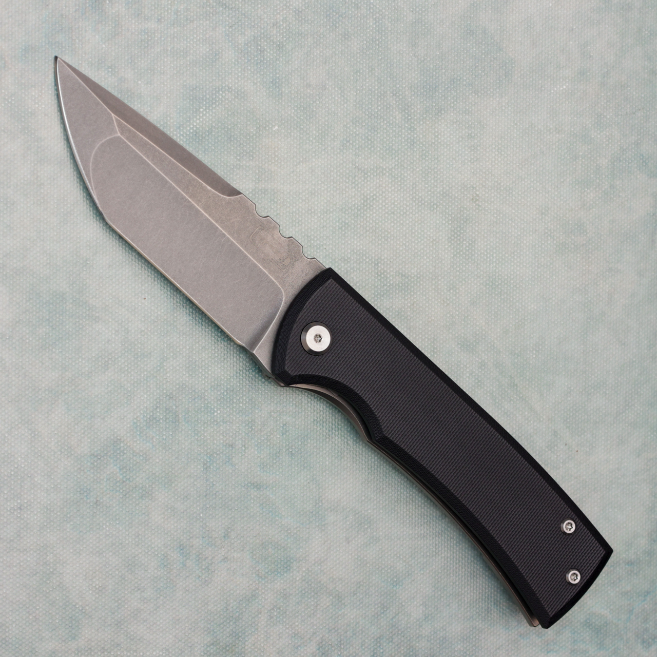 This Mid-Tech version features stonewash finished titanium and black G-10 handle. Satin finished M390 tanto blade with standard cutting edge etched with Chaves key logo. Framelock with replaceable lockbar insert. Complete with a tianium backspacer- perfect for customizing! For the money, there isn't a better mid-tech type production flipper that we can think of. This is one great knife, with a great price point. This one has been acid washed and sharpened. The kick stop is a little sloppy when the knife is closed, but it does function and work properly. No signs of other wear, with box.