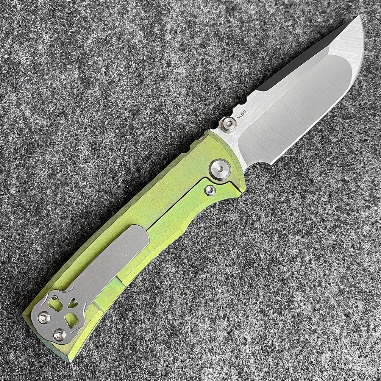 This model features antique green anodized titanium handle (done in house in our custom shop). Satin finished M390 drop point single edge blade with standard cutting edge etched with Chaves key logo. Framelock with replaceable lockbar insert. Complete with a tianium backspacer- perfect for customizing! This is one great knife, with a great price point. Extra Standard Clip included. Brand new in box.