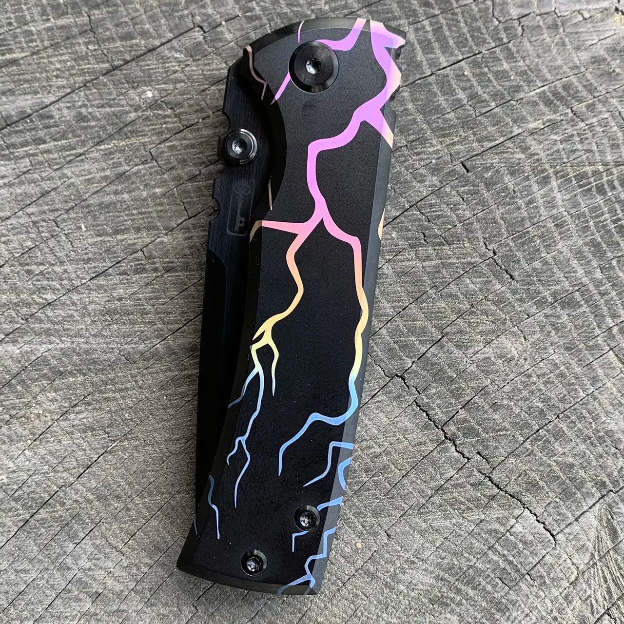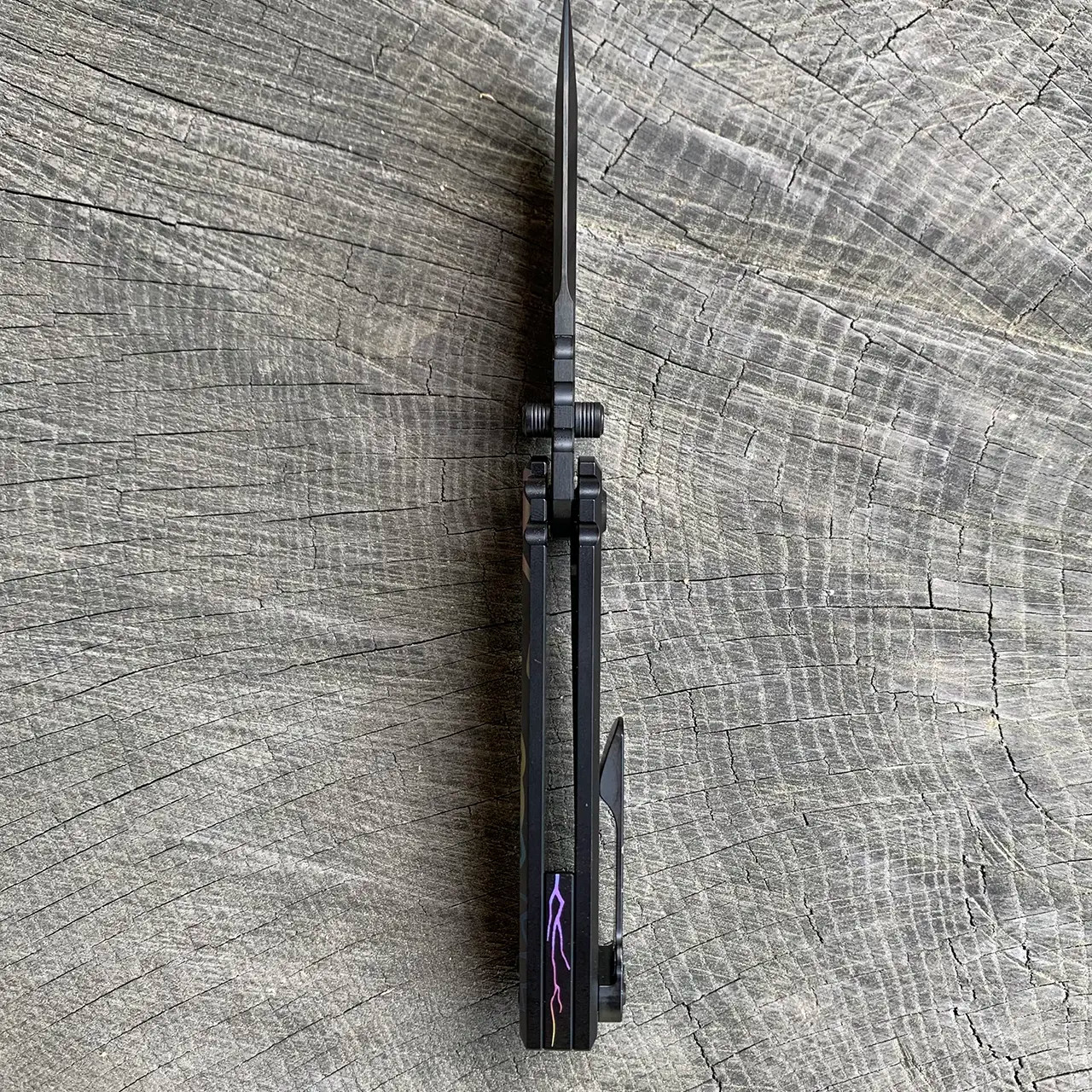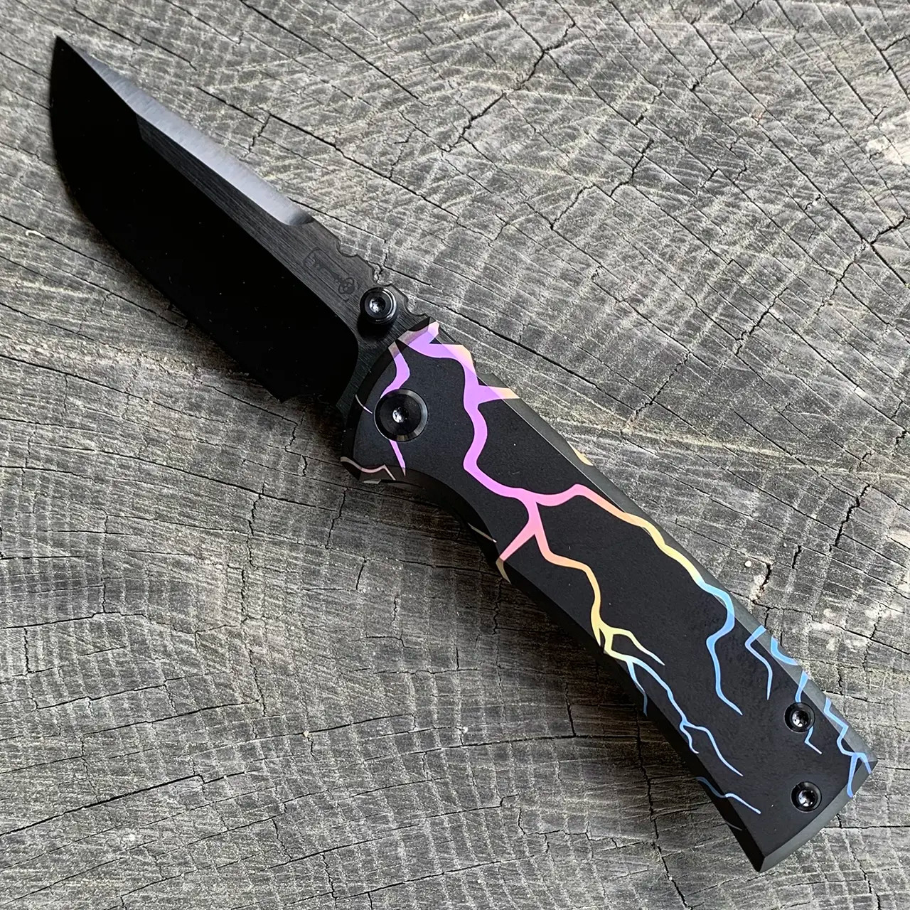 This model features DLC titanium handles with the show side lighting fade anodized. DLC finished M390 drop point blade with standard cutting edge etched with Chaves key logo. Framelock with replaceable lockbar insert. Complete with a DLC tianium backspacer with lightning fade ano. This is one great knife, with a great price point. Extra Standard Clip included. Brand new in box.