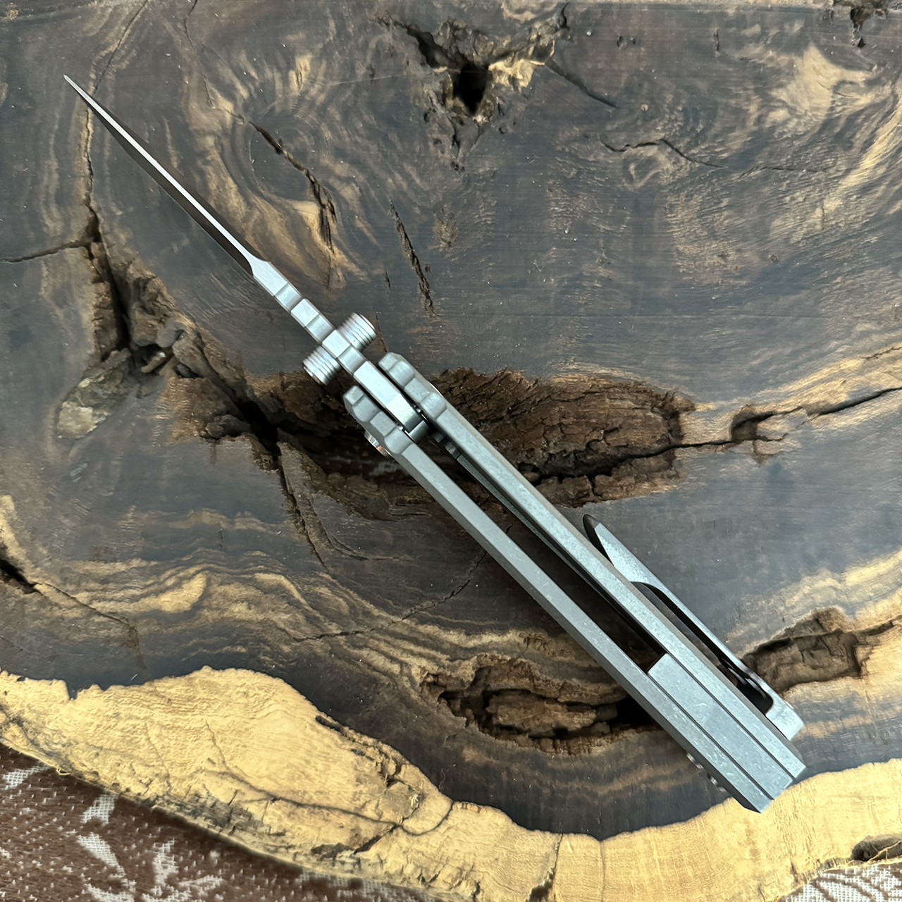 Chaves Ultramar Redencion Street Framelock S/E Laser Distressed Titanium Handle Satin Blade AE Custom Shop ST/RDP/SWTI/BF/LDIS