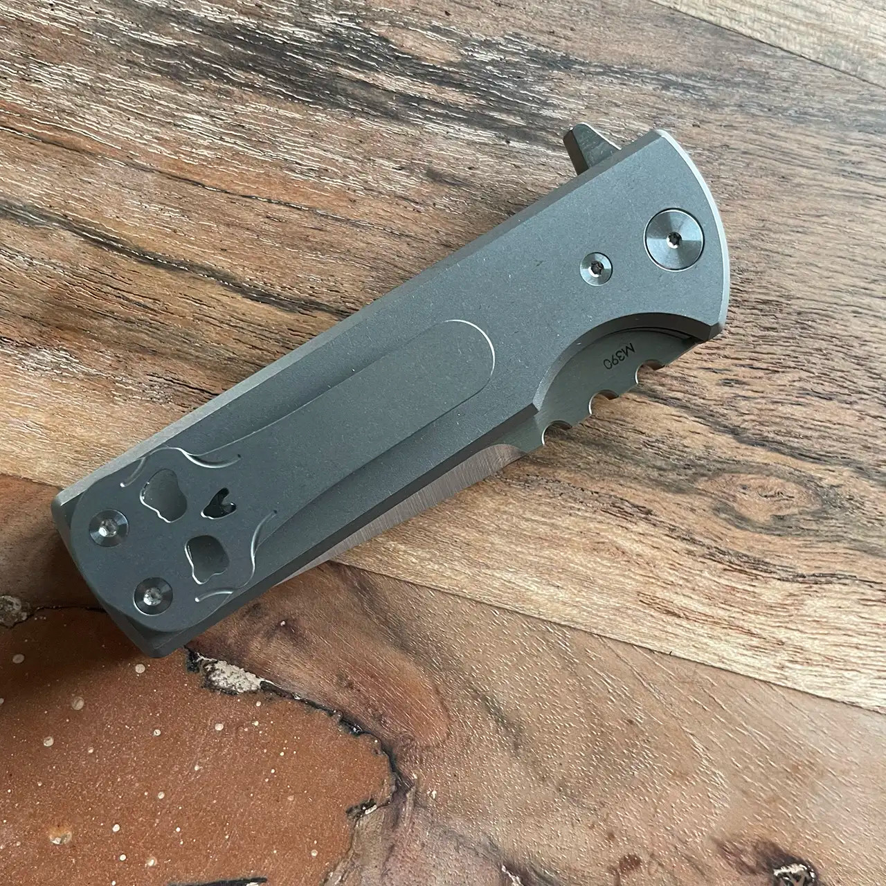 This particular version features a stonewashed titanium handles. Satin finished drop point blade with standard cutting edge. Standard skull clip and secondary standard clip included.