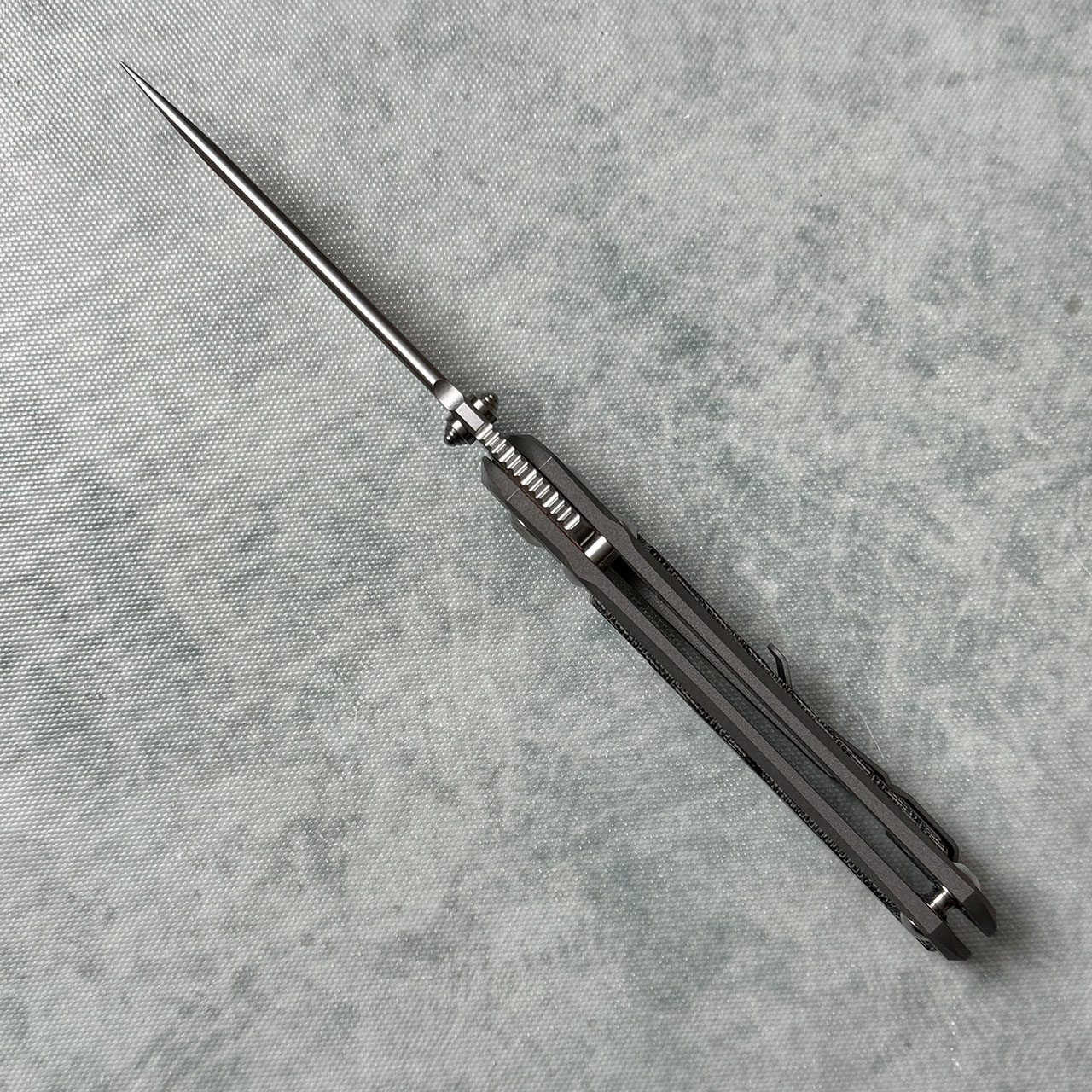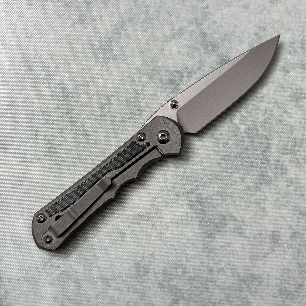 This model features titanium handles with black canvas micarta inlays, a CPM-MagnaCut drop point blade. Few small snails on clip otherwise excellent pre-owned condition in box.