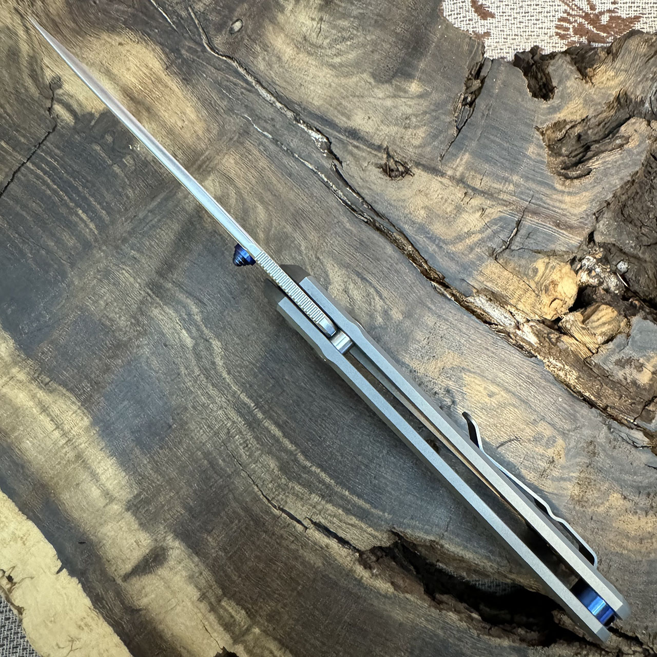 This model features glass blasted titanium handle scales, stonewash finished CPM-MagnaCut stainless steel drop point blade. Matching titanium pocket clip for tip up carry. Blue single thumb lug and spacer. Like new in box with paperwork and polishing cloth. Does have a couple of minor snails near pivot that only show in certain lighting.