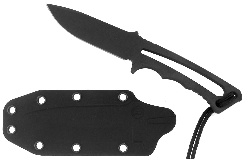 The frame style knife fits snugly into a slim Kydex sheath so it is readily accessible, whether tucked into a cargo pocket or attached to a MOLLE vest. A 36 inch nylon lanyard is threaded through holes in the handle and tied in such a way that the sound of the knife being laid on a hard surface will be muffled. New in box.