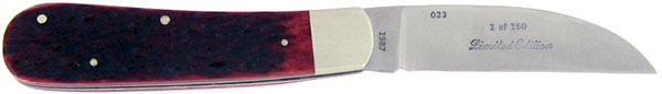 Real nice deep red jigged bone handle scales. Satin finished stainless steel sheepsfoot blade stamped HAPPY JACK with the Happy Jack U.S.A. logo. The blade has good strong open and close snap. The reverse side of the blade is stamped 1987 1 OF 150 LIMITED EDITION with the serial number #023. Nickel silver bolsters, liners, and handle pins. Brass inlaid Happy Jack logo shield. This knife is in new condition and the Happy Jack knives are becoming harder and harder to find. Beautiful pocket knives by Chuck Garlits.