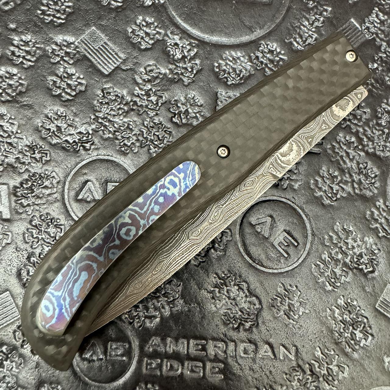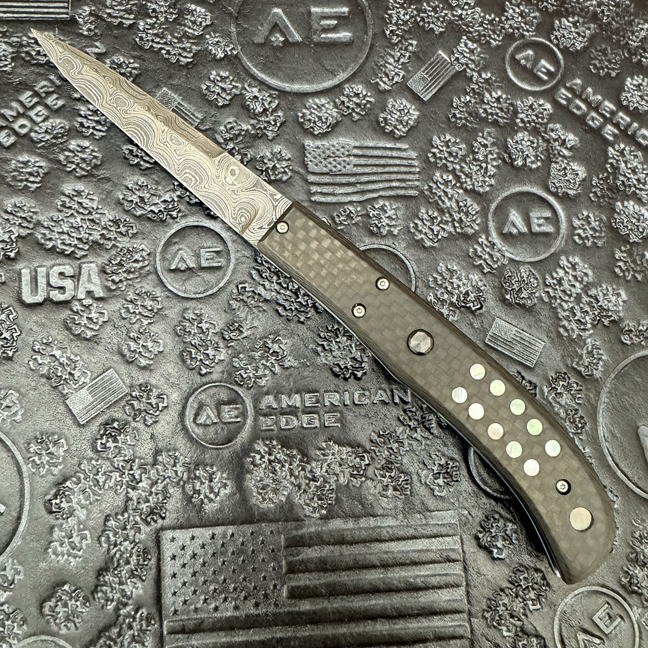 Chuck Gedraitis Custom Gamblers Auto Carbon Fiber Scales w/ Black Lip Pearl Inlays Vegas Forge Damascus Blade