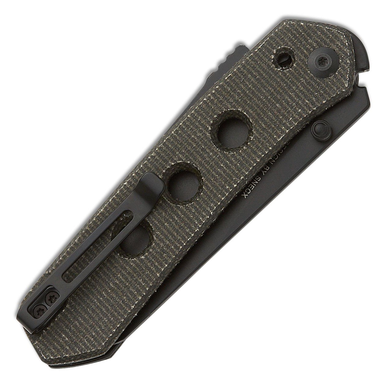 This model has dark green canvas micarta handles, and a black nitro-v reverse tanto blade. Reversible deep carry pocket clip. Brand new in box.