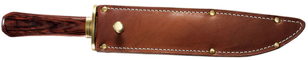 Big, broad, and beautiful are the only three words necessary to describe Cold Steel's Laredo Bowie. It's long, thick blade of SK-5 High Carbon steel is flat ground and features a curved cutting edge that terminates in a dagger sharp point. For maximum versatility as a weapon it also sports a 4 1/2 long fully sharpened false edge to facilitate the deadly back cut as well as forehand blows. The cocobolo handle of this Laredo Bowie, in the classic coffin shape, is contoured to fit the hand snugly and provides a positive grip when cutting, chopping, or thrusting. To compliment the blade and handle Cold Steel has added a highly functional guard and bolster made of mirror polished brass. The whole package comes housed in a traditionally styled scabbard made of thick, heavy leather. Brand new in box.