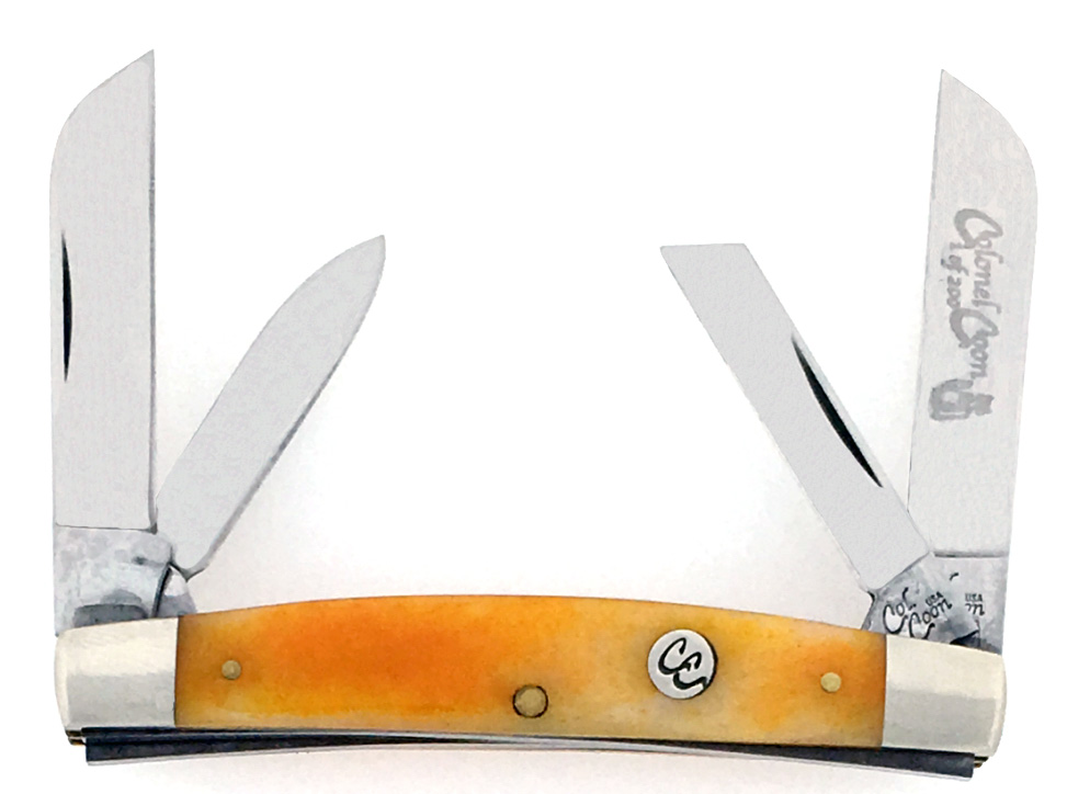 Beautiful sunset smooth bone handle scales. Polished 420 stainless steel twin sheepsfoot blades, one is etched with the Colonel Coon logo 1 of 200. Also has a spear point blade and a coping blade. Brass liners and handle pins. Nickel silver bolsters and inlaid Colonel Coon shield. Genuine quality American made Colonel Coon pocket knife. Comes brand new in the original two piece box.