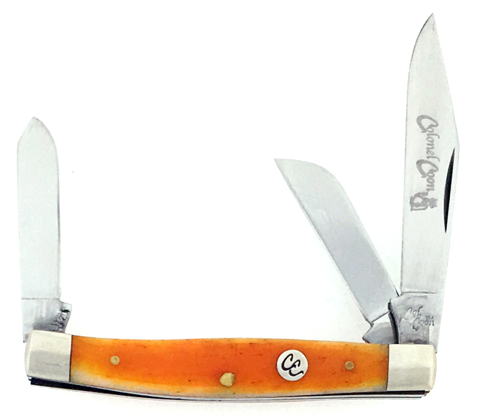 Beautiful sunset smooth bone handle scales. Polished 440 stainless steel clip point blade etched with the Colonel Coon logo, sheepsfoot blade and spey blade. Brass liners and handle pins. Nickel silver bolsters and inlaid Colonel Coon shield. Genuine quality American made Colonel Coon pocket knife. Comes brand new in the original two piece box.