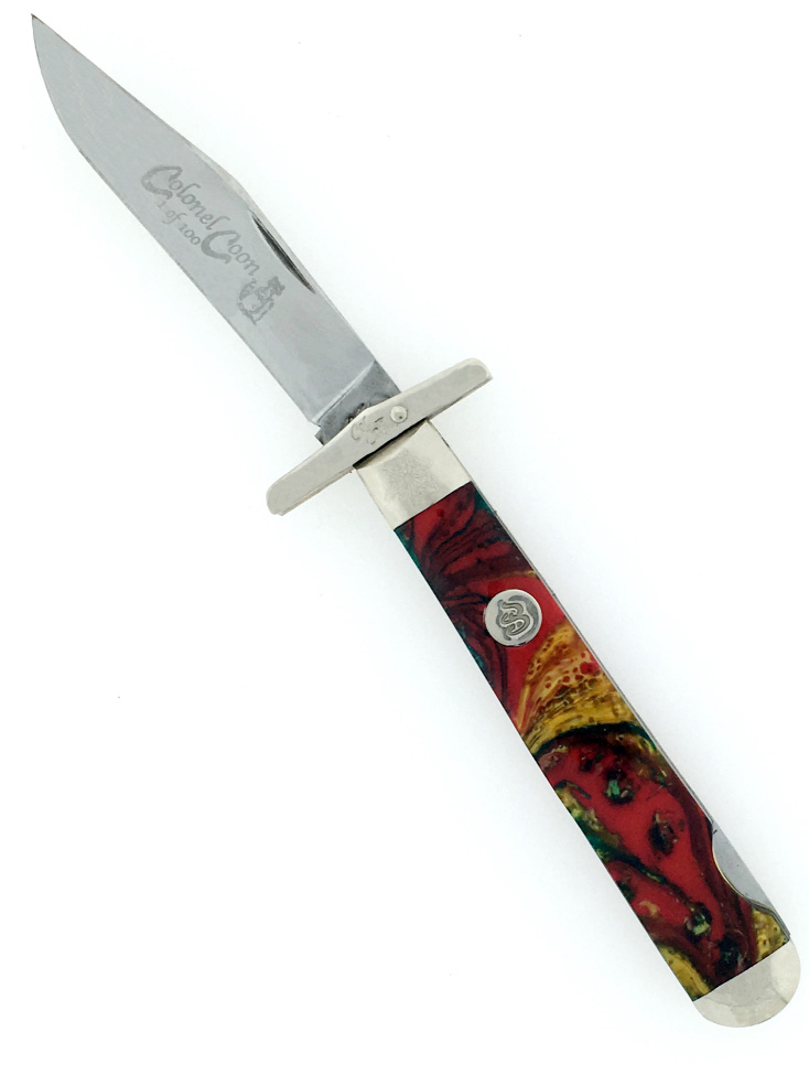 Nice looking Christmas Tree swirl celluloid handle scales. High polished 440 stainless steel clip point blade etched COLONEL COON 1 OF 100 on the front and Special 2013 Christmas Edition XX of 50 with a Christmas Tree on the back. Nickel silver bolsters with engraved snowflakes, swinging guard stamped Col. Coon USA and inlaid Colonel Coon shield. Brass liners. Genuine quality American made Colonel Coon pocket knife. Comes brand new in the original two piece box.