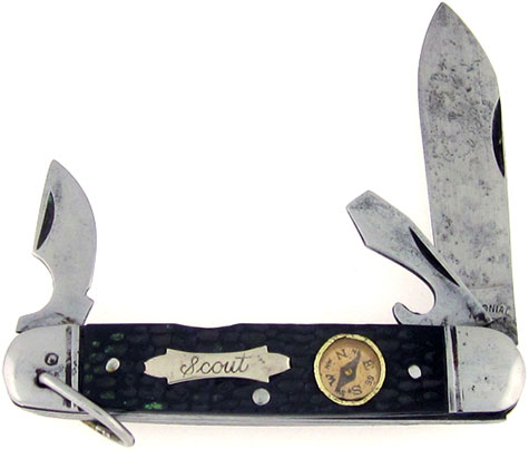 Black jigged delrin handle scales. High carbon steel spear point blade, can opener, and cap lifter screwdriver. All blades have good snap. Fancy fluted steel bolsters, liners, handle pins, and bail. Nickel silver inlaid SCOUT bow tie shield. Also inlaid into the handle is a really cool small brass compass, it makes this knife unique. Awesome antique three blade scout knife. The blade have some light pitting which really add character to this knife. Excellent condition hardly used at all.