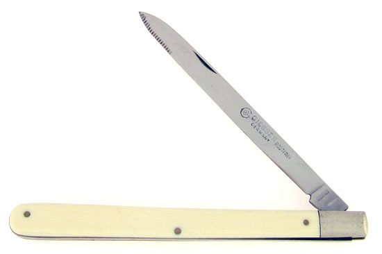 Real nice ivory delrin handle scales. Polished stainless steel slim melon tester blade with serrated tip. The blade has good strong snap and is etched GIESSER GERMANY ROSTFREI with four leaf clover logo. Brass liners and handle pins. Nickel silver bolsters. Useful and collectible German made melon tester knife. Mint condition.