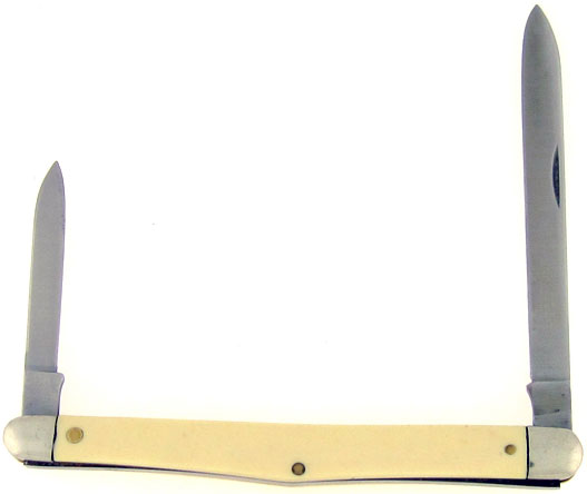 Smooth ivory delrin handle scales. Satin finished stainless steel spear point melon tester blade and shorter spear point melon tester blade. The blades have good strong snap. Brass liners and handle pins. Simple and useful melon tester pocket knife. New unused condition.