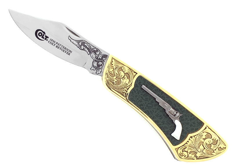 Colt Franklin Mint Collector Knife. Brass handle scales with fancy scroll engraved bolster sections and green simulated ray skin inlays. Polished stainless steel clip point blade etched COLT 1836 PATTERSON COLT REVOLVER with fancy scrolling. Steel liners. Inlaid Colt 1836 Patterson Revolver shield and brass Franklin Mint Collectors Knives shield. Awesome Colt Franklin Mint collectors series knife. Comes new in padded and zippered case.