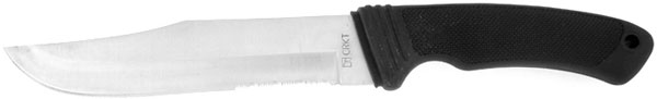 Textured kraton grip handle with reinforced lanyard hole. Satin finished stainless steel clip point blade with partial sawtooth serrations. Awesome fighting/ hunting knife at a sweet price. Comes with quality CRKT black leather belt sheath.