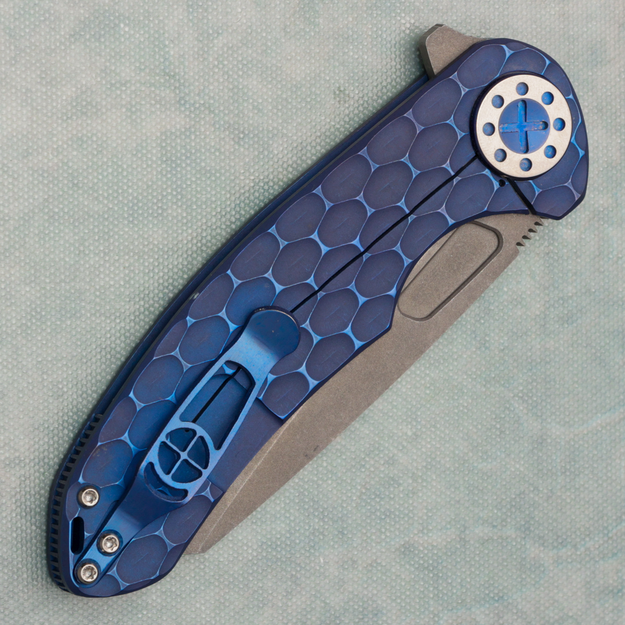 This version features a blue anodized jigged titanium handle and a bead blast finished MagnaCut wharncliffe blade. Great egos and action. Blade does show some marks, no box.