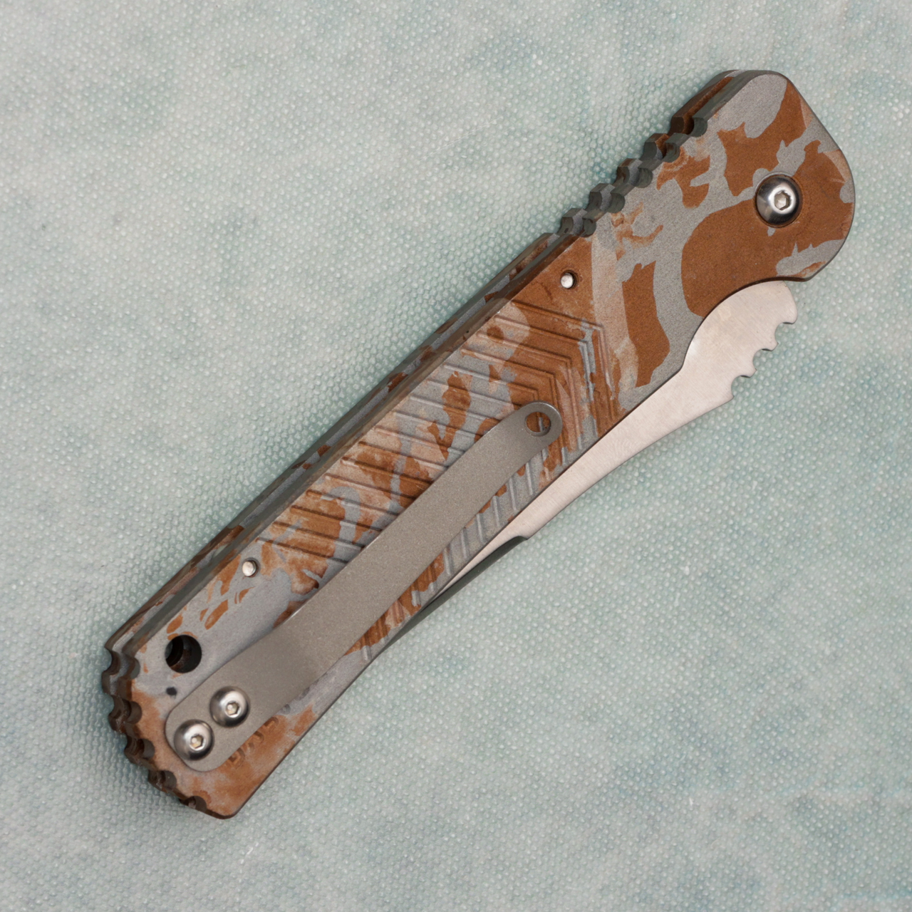 Dalton 07 Militia side opener auto, has camo aluminum scales and a satin part serrated blade. In great condition from a collector.