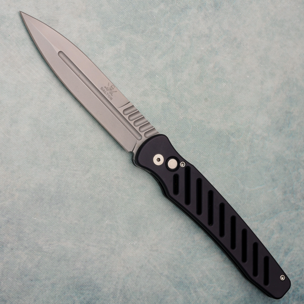 Dalton Battle Bones Proto Variant 3 side opener auto, has slotted black aluminum scales and a bead blast dagger blade. In great shape from a collector, with just a few marks on clip and handle.